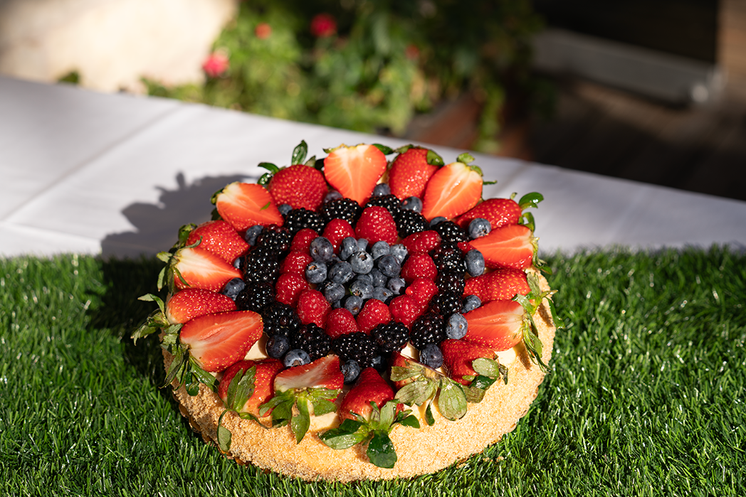 A delicious mixed fruit cheesecake made in-house at Mozart's On The Lake.